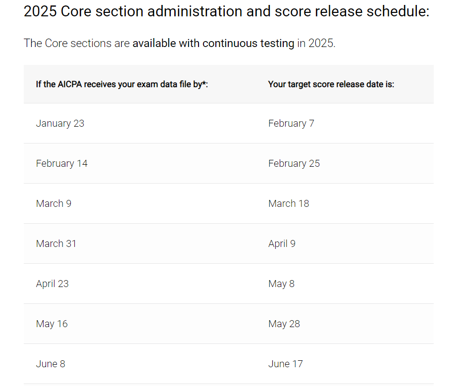 1.Core시험(FAR, AUD, REG)결과 발표일을 아래와 같이 볼 수 있습니다.